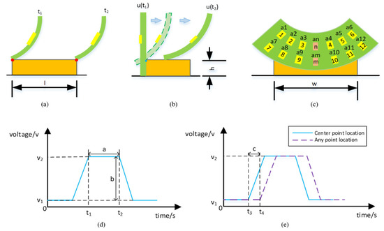 As the cup travels inside a smooth pipeline, the deformation of the cup is expected to be uniform, due to the constant pressure differential across the cup in the axial direction. However, as the circumference of the cup starts to make contact with the debris lodged on the wall, unbalanced deformation will occur. Since the pipe often encloses high pressure fluid, the area of the irregular blockage and deformation of the pipe wall can be a huge threat, which might cause blockage or even rupture. Therefore, understanding the upper and lower boundaries of the debris’ shape can be key to proactive pipeline maintenance. To define the envelope of an object’s three-dimensional space, dimensions along the three Cartesian coordinates are required. If one applies a type of curvature-sensing grid onto the cup surface, to record the localized differences in signal strength, then, the dimensional information of the target debris may be obtained. To do so, one needs sensor feature descriptors to define the correlations with the three orthogonal axes. Assuming the curvature signal from one point of the sensing grid is continuous and differentiable in time, a sudden contact with the debris will be reflected similarly as a hump in the undisturbed signal, where the disturbed duration may be correlated to the length of the debris, while the strength of the signal reflects the debris height, and the time difference among different sensing units in the grid can be used to determine the width of the debris, as illustrated in Figure 3. In this way, the magnitudes of length (L), width (W) and height (H) of the foreign object can be obtained, through evaluating the temporal features from the expected outputs of the sensing grid. The features are defined in Table 1.