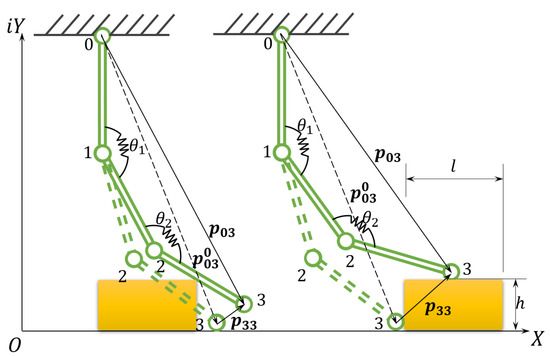 If no debris exists in the traversal direction of the cup, the cup should experience constant deformation, if the surface roughness, travel speed or flow pattern do not affect the cup dynamic equilibrium. In this work, the cross section of the cup is assumed to be 1D, and the cup is assumed to be sectionally rigid, where the rigid sections are connected by flexible joints. A disturbance vector, , is defined, to capture the deviation of the outer rim (as the tip 3 in Figure 4) from the non-disturbed case. A special case of three sections with two joints is shown in Figure 4.