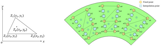 Schematic diagram of planar data interpolation. Note the numbers in circles mark the triangles for interpolation operations, treating the fixed points as known.