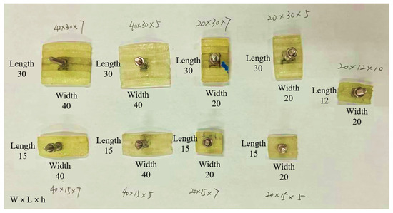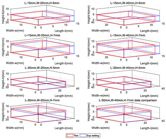 Finally, Figure 14 visualizes the measured debris dimensions as the prototype cup crosses over a selection of mock debris blocks. The proposed device and measurement method has demonstrated good consistency between the measurement results and the experimental settings. The maximum deviation of the tested model from the experiment or the absolute measurement errors of the height, length, and width are found to be 1.23 mm, 1.92 mm and 1.18 mm, respectively. If compared with the outer diameter (OD), the detection accuracy can be found to be between 1.18% (OD) and 1.92% (OD), which can be comparable in terms of performance with the state-of-the-art market products such as the TDW’s high resolution deformation measurement tool for smart PIG’s [20]. Moreover, it was found the accuracies in the three orthogonal directions are around the same magnitude, suggesting the features designed in Table 1 allow for accurate and balanced detection of pipe debris’ boundaries. However, it is worth mentioning that this result was conducted under laboratory condition using squared surfaced mock debris blocks, and without actual interferences such as the pressurized environment and transient flow fields. Nonetheless, the initial performance of the proposed device has been demonstrated and potential application can be promising. In the future, more detailed testing and under near-production-line conditions experiments will be conducted to further study the characteristics of the smart cup with 2D sensing grid.