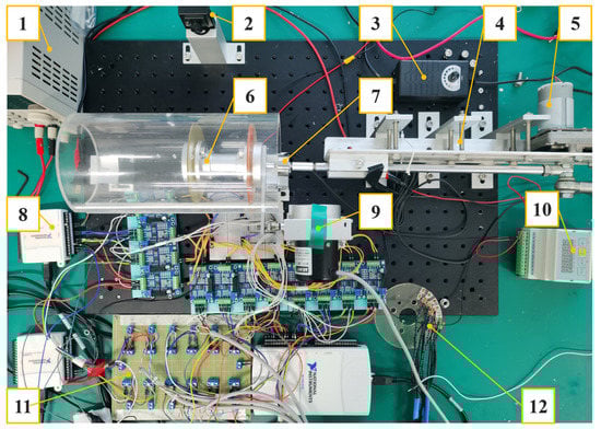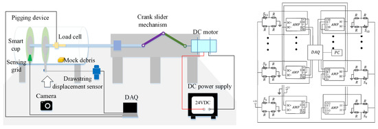 To emulate the working environment of the PIG, a Φ100 mm test bed was designed and assembled in the lab. The experiment bench device is composed of a crank slider driving mechanism, a smart cup prototype, a transparent pipeline, and a mount for installing different sized debris for testing. The operation principle of the testbed is shown in Figure 8. A crank-slider mechanism, driven by a DC motor was used to emulate the pressure differential driving force to realize the translational motion of the prototype. A load cell was mounted on the axial with a range of 0–500 N and an accuracy of 0.2%. A drawstring displacement sensor with range 0–350 mm, accuracy 0.15% was used to determine the motion and displacement of the smart cup. The data signals were collected via a data acquisition unit (DAQ). As for the prototype smart cup, a strain gauge grid of 12 nodes was laminated on prototype cup substrate, where each node was equipped with a bridge and an amplifier circuit for signal differentiation and amplification. Each bridge circuit was composed of 3 120 Ω fixed-value resistors and 1 120 Ω strain gauge. The bridge and the amplifier circuits were powered by two 5 V DC power supplies to avoid common mode interference. Before the general experiment, each bridge and the corresponding amplifier was calibrated to a common zero with same amplification factors. In addition, the relationship between the primary (x-axis) displacements of the strain gauges versus output voltages were also obtained using camera data. The sampling frequency of the acquisition device was 2 kHz, and the duration of each acquisition was 5 s. A photo of the testbed is shown in Figure 9, and the rest of the specifications can be found in Table 3.