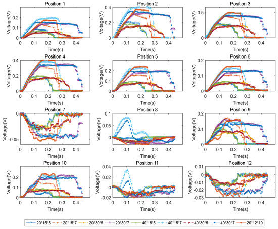A set of experiments with different mock debris blocks were tested to demonstrate performance of the prototype smart cup. For specific mock debris block, five groups of tests were carried out to reduce random error. During each experiment, the test bed was controlled to run only one motion cycle (a clockwise 2π rad rotation of the crankshaft from its set zero location). The driving starting position and driving power of the crank-link mechanism driving device were consistent among the tests, so as to ensure that the sensing grid was subjected to the same force at the moment of contacting the obstacle block. The output voltage signals of No. 1–12 strain gauges passing through different obstacles are shown in Figure 10. Obviously, as the smart cup crosses over different sized obstacles, the corresponding voltage signals from the sensing grid vary as well; also, the signal strength values are distinctive enough from case-to-case to allow for further dimensional determination tasks, which all validate the basic functions of the proposed device.