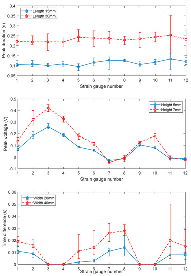 Features analysis. Note: (top) signal peak duration, (mid) peak voltage, and (bottom) signal initiation time difference referenced to the central positions (m, n in Figure 3). The error bar denotes the bounds that contain 5 separated tests under the same condition.