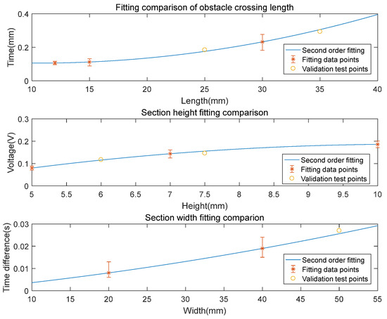 The results in Figure 11 have demonstrate the selected features can be used as the excitations for the disturbance vector calculation. Since in the current experiment, only two rows of sensors were implemented, the order for the Equation (6) is set to 2. Based on the features definitions in Table 1, quadratic regression operations of the three key dimensional factors were conducted, the resulted coefficients can be found in Table 4. Based on the regression coefficients, the debris block’s dimension regression results are plotted and validated in Figure 12. The results have demonstrated good second order fitting of the experimental data points. By testing out the three regression functions against a new set of experiments, the maximum error between the model and experiment is less than 5.1%, and the regression results are believed to be reasonable.