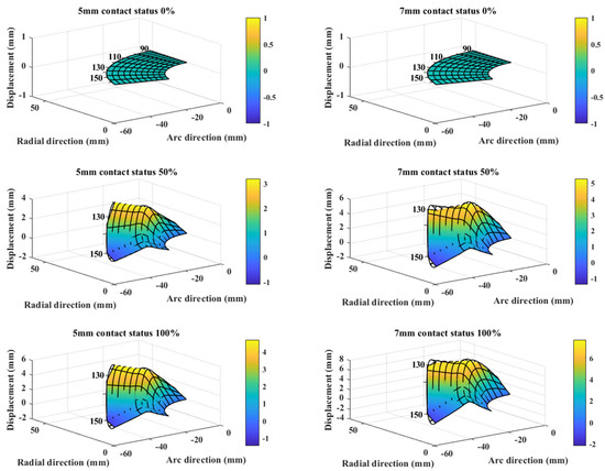 With the dimension parameters of the debris block obtainable with the proposed smart cup, efforts were made to visualized the measured debris. Figure 13 illustrates the sensing grid displacement map as the prototype crosses over the debris blocks of 5 mm or 7 mm height. Since the prototype sensing grid has only 12 measurement points, the signal magnitudes at the blank space were interpolated using Equation (7). Obviously, when the cup is not in contact with the debris block, no deformation is found, as the cup makes further contact with the block, the displacement continues to increase. Same trends were observed for both the 5 mm and 7 mm cases. Specifically, as the height of the debris block increases from 5 mm to 7 mm, the maximum displacement value in the 50% contact case increases from 3.1 mm to 5.3 mm, and for the 100% case, from 4.5 mm to 7.7 mm.