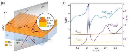 (a) Sketch of the patterned 1DPC in the conical diffraction mounting. The topographic modulation is oriented along the x-direction. Light is incident from the glass substrate at an angle of incidence; (b) refractive index dispersion of the materials considered in this work.