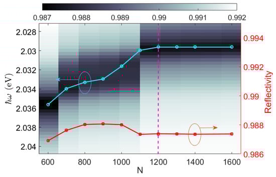 Calculations were performed by means of a freely available implementation of the Rigorous Coupled Wave Analysis (RCWA) RETICOLO [52,53]. The RCWA supercell includes the spacer surrounded by 180 DBR periods on each side. The periodic corrugation has an associated Bragg grating vector oriented along the x-axis, i.e., The conical mounting configuration is considered so that the incoming radiation can be made incident onto the bottom interface of the multilayer at an incident angle with respect to the normal (z-axis) and at an angle with respect to the x-axis. At , the incident light is parallel to the and diffracted accordingly. Illumination is always provided from the glass substrate to reach momentum values beyond the light line in air, as required for BSW coupling. RCWA is a Fourier-based method involving a Rayleigh expansion of the diffracted field as well as a Fourier decomposition of the structure harmonics. For this reason, it is crucial to define the proper number of Fourier terms to be retained in the calculation. The case of the spacer surrounded by DBRs is addressed using N = 1200 Fourier terms. In the convergence plot in Figure 2, the spectral position of the BSW cavity mode and the corresponding reflectivity are shown as a function of the number of Fourier terms considered. Such a supercell contains a number of DBR periods large enough to avoid significant cross-talk effects between adjacent supercells occurring in the momentum–energy region wherein the cavity mode is located. Instead, the simpler case of a purely periodic corrugation (i.e., no spacer) is modeled as an elementary cell containing a single DBR period and N = 60 Fourier terms for assuring reliable results.