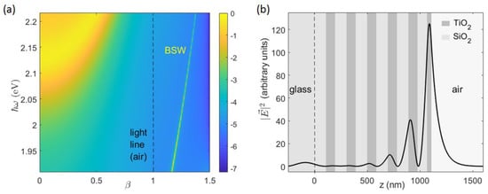 (a) Calculated TE−polarized of the flat 1DPC, with illumination from the bottom glass substrate at an incidence angle such that ; (b) intensity profile of the BSW at eV, normalized to the amplitude of the incident wave.