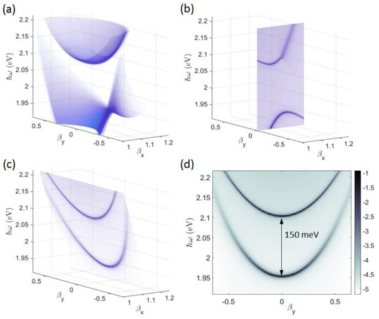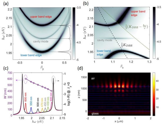 The periodic modulation along the x-direction results in a folding of the BSW dispersion and the formation of a forbidden band that is dispersed in energy. To facilitate the interpretation, the BSW folding and the corresponding energy gap at (corresponding to , i.e., a direction parallel to the grating vector ) is presented in Figure 4b. The folding of the BSW dispersion due to diffraction at the order results in a gap opening at about 2 eV. As pointed out elsewhere [40,54], the energy gap width depends on the effective refractive index contrast introduced by the periodic modulation. More interestingly, along directions different than , the gap shifts to higher energies. Band edges are identified at the intersection of the surface (first Brillouin zone boundary, ) with the full BSW dispersion, as shown in Figure 4c. The forbidden band can be better appreciated by projecting said BSW dispersion onto the plane (Figure 4d). A maximum bandgap of about 150 meV at is found. For larger values of and higher energies, the bandgap is narrowed down.
