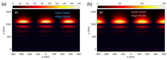At each bandgap edge, two counterpropagating BSWs are produced, whose interference pattern has a spatial period equal to the DBR period . In Figure 5a,b, the normalized intensity distributions of the BSWs at the lower and the upper band are respectively shown. The field localization on either the ridges (high refractive index regions) or trenches (low refractive index regions) reflects the different energies associated to the two band edge modes. Calculations are performed at eV and eV for the lower and the upper band edge modes, respectively. In both cases, is taken on the boundary of first Brillouin zone, i.e., , while . Field amplitudes are normalized to the incident radiation amplitude.