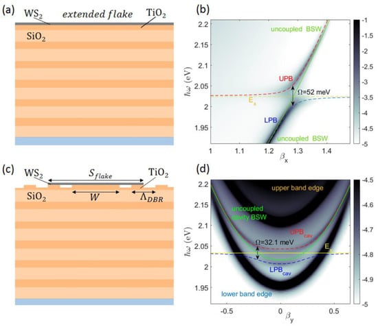 (a) Sketch of the z-cross section of the flat 1DPC topped with a uniform WS2 monolayer with an indefinite extension; (b) corresponding dispersion of BSW polariton; (c) sketch of the z−cross section of the 1DPC patterned with the cavity topped with a WS2 monolayer. The flake has a lateral size and a thickness 0.65 nm; (d) corresponding dispersion of the BSW cavity polariton branches (UPBcav and LPBcav).