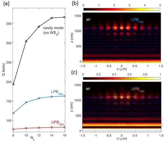 Losses due to the WS2 exciton resonance affect the mode quality of the two polariton branches. Figure 8a shows a calculated quality factor for the bare BSW cavity mode, UPBcav, and LPBcav in multilayers made of 8 to 16 layers. For all three modes, resonance frequencies are recorded on the corresponding dispersion curve, at . While an increase in Q with the number of layers NL is ascribed to a decrease in leaky power tunnelling through the 1DPC, the absorption by WS2 is responsible for the lower quality of both polariton branches, as compared to the bare cavity mode. Furthermore, the upper branch polariton is more severely attenuated, as also observed experimentally in an analogous system involving strong coupling between ZnO excitons and BSWs [12]. Intensity distributions calculated for UPBcav and LPBcav at are localized in the neighborhood of the spacer, similar to the bare cavity mode, with a substantially reduced enhancement due to losses (Figure 8b,c).