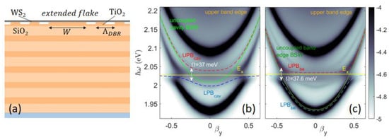 It is interesting to note that the BSW hybridization presented above involves the cavity mode only. This is due to the limited size of the WS2 monolayer, which overlaps mainly with the cavity spacer, where most of the energy is localized. Instead, if the whole patterned 1DPC is topped with an extended monolayer (Figure 9a), the BSW hybridization is found to occur also with the BSW band edge modes, as shown in Figure 9b,c, resulting in upper and lower band edge-polariton branches (UPBbe and LPBbe). Here, we find a Rabi splitting 37 meV for the BSW cavity polariton, and 37.6 meV for the lower BSW band edge polariton. The different spatial distribution of the band edge and the cavity modes enables us to further modulate the photonic mode–exciton interaction by controlling the size and position of the WS2 monolayer transferred onto the BSW platform.