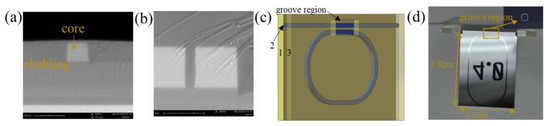 The preparation process used inductively coupled plasma (ICP), plasma-enhanced chemical vapor deposition (PECVD), and lithography techniques, which are well-developed to ensure universal applicability. Moreover, the local etching is innovatively added at the end, which can guarantee the acoustic wave adequately interact with the evanescent wave after the evanescent field is excited. The next step is optical fiber coupled with a waveguide via the aligned coupling platform and fixed by optical adhesive. Finally, we put it on the stove for more than 8 h to solidify. The resonator structure is simple, easy to process and design, being applicable to sensing the sound. Figure 1 shows the cross-section of the groove region, the 3D structure diagram, and the finished product.