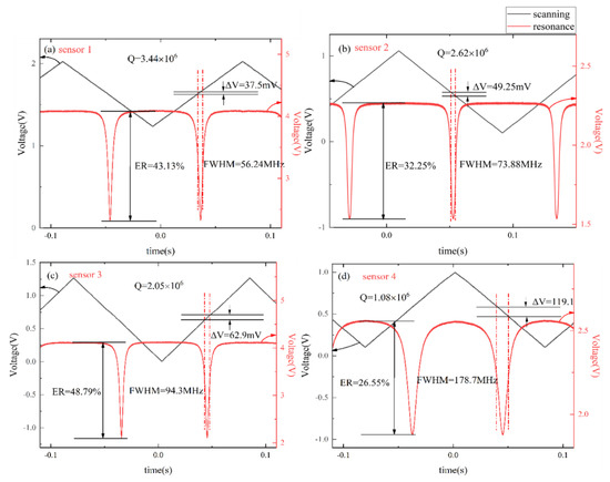 According to the process characteristics, the parameters of the resonators are tested and compared, and the results are shown in Table 1. On account of the resonators having high Q-factors, the laser used in the experiment is a narrow linewidth laser (E15, central wavelength 1550 nm, NKT Photonics, Birkerød, Denmark). Under the scanning of the external signal source, the frequency of the output light wave changes periodically with the external source. The full width at half maximum (FWHM) of the resonance and extinction ratio (ER) can be obtained by calculating the corresponding voltage difference of the scanning signal.
