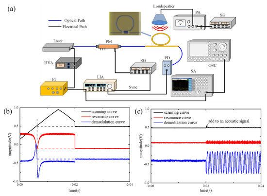 The laser is controlled by the scanning signal derived from the PI module through the HVA. The beam from the laser passes through the PM and enters the ring resonator. Then, the beam of the ring resonator goes into the PD to complete the photoelectric conversion. The LIA receives the signals from the PD and SG for demodulation. When the lock switch of the PI module is in the disabled state, the output frequency of the laser changes linearly under the scanning of the triangular wave, and the resonator outputs the resonant spectrum line with periodic changes. Synchronous demodulation is realized through the LIA. When the lock switch of the PI module is off, the laser makes the resonance spectrum line slowly enter the resonance valley under the action of the scanning signal, then the digital proportional integration control module (PI) starts after the circuit captures the resonance valley signal. The resonance curve, demodulation curve, and resonance valley variation are synchronized, and the PI module control laser only works in the linear region of the demodulation curve; as a result, the laser frequency fails to mistakenly lock outside the resonance valley. The demodulation curve as an error signal to feedback controls the laser frequency, and the feedback control circuit of the PI module changes the laser-scanning voltage. In consequence, the error signal is reduced until zero; at this time, the laser frequency is statically locked at the resonant point, as shown in Figure 4b. After frequency locking, the response of the sensor to the acoustic signal is reflected as the deviation of the relative zero of the demodulation curve. The source of the acoustic system is composed of a loudspeaker, power amplifier (PA), and SG. When an acoustic signal adds to the system, the demodulation curve shows an apparent amplitude change, as shown in Figure 4c, and is connected to the SA to obtain a direct image of the frequency after the FFT transfer.
