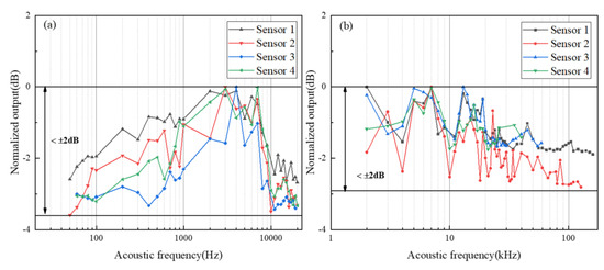 The frequency response and flatness of proposed sensors: (a) the frequency response with the loudspeaker; (b) the frequency response with the piezoelectric ceramics.