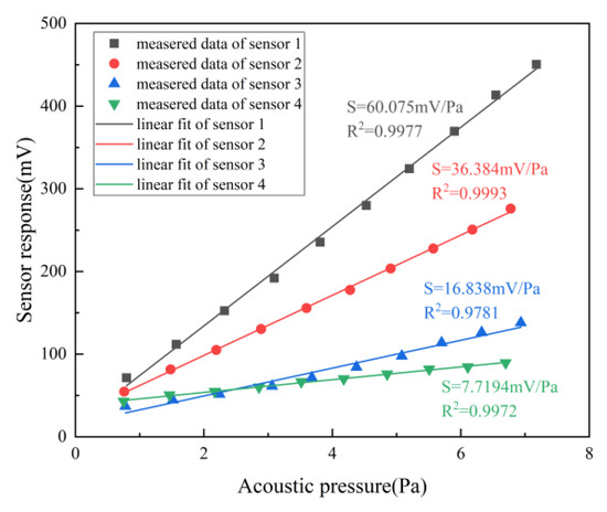 Sensitivity is one of the main exhibitions of acoustic performance, which is expressed as the fitting slope corresponding to the ratio of the output voltage value of the sensor and the sound pressure measured by the standard sound level meter (AWA5661), expressed in units (mV/Pa). The SG generates a 1 kHz sinusoidal signal and remains consistent, and after amplification by the power amplifier, the signal is connected to the sound system. By controlling the amplitude of SG, the acoustic source outputs signals with different sound pressure levels. In the experiment, the SG amplitude increases successively from 1–10 V with a step of 1 V. The voltage output of the sensor on the oscilloscope and the sound pressure value of the standard sound level meter are recorded, respectively. As shown in Figure 6, with the increase of the driving voltage of the sound source, the sound pressure level is gradually enhanced, resulting in the noted variation of the refractive index, and finally, the detection signal rises. It is pronounced that the linearity is great due to all R2 being above 0.97. Moreover, the output voltage of the sensor will show a drastically growing trend if the Q-factor is higher. As a result, the sensor with a Q-factor of 3.44 × 106 represents a high sensitivity of 60.075 mV/Pa. The sensitivity of the electric acoustic sensor is high, but the frequency response is limited by the resonant characteristics of the diaphragm, and the optical fiber acoustic sensor based on the diaphragm is similar. At present, although the sensing technology of ring resonators based on detecting the change of the air refractive index caused by sound pressure is not as sensitive as the acoustic sensor relying on a sound-sensitive diaphragm, it is predominant in a good linear response frequency, without frequency dependence and the influence of the mechanical resonance frequency.
