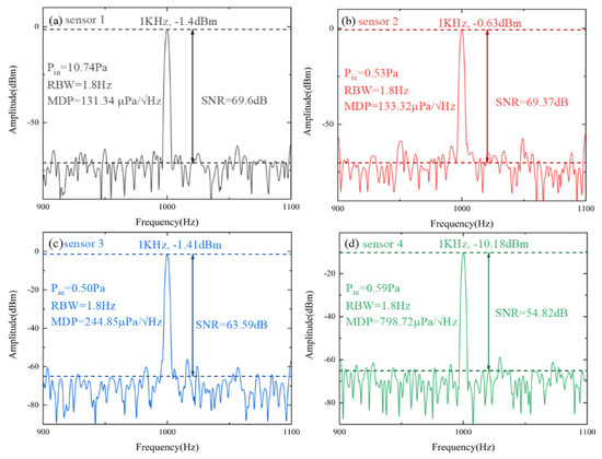 Another performance index corresponding to sensitivity is the minimum detectable sound pressure (MDP). In the experiment, after giving the speaker a sine sound signal of 1 kHz, the frequency spectrum analyzer is tuned to the corresponding range to collect data. Pin is the real-time sound pressure level obtained by a standard sound level meter, and RBW is the resolution bandwidth of SA. Both RBW and SNR can be accessed through the relevant parameters on the spectrum analyzer. The noise floor is the average of the environment noise without the sound signal. In the experiment, the noise floor is obtained by estimating the average value of the frequency range other than the acoustic response frequency. SNR is the difference between the peak and noise floor. Yang et al. proposed the SOI microring resonator [27] which has an SNR of over 50 dB at the measured frequency of 58 kHz. In the paper, we measured frequency at 1 kHz with SNR over 54 dB and calculated MDP further. The MDP measurement is limited by the sensitivity of the system as a result of the sophisticated signal demodulation system required by optical detectors. On the other hand, the MDP is subject to the noise of the physical measurement environment, which can be mitigated if the measurement is carried out in an anechoic chamber to further reduce the minimum detectable sound pressure. It can be reflected from Figure 7 that the ability to pick up weak sound signals with sensitivity increases. The equation for calculating MDP is defined as follows: