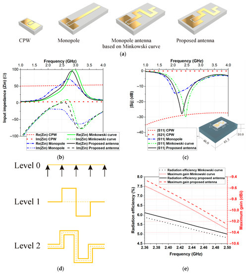 Design process: (a) numerical models of CPW and different configurations of the antenna during the design process, (b) input impedance, (c) magnitudes of the reflection |S11| and transmission |S21| coefficient, (d) generation of the antenna using the quadratic Koch curve, also known as the eight-segment Koch curve or Minkowski curve, and (e) comparison of the radiation efficiency and maximum gain of the proposed antenna and monopole antenna based on Minkovski curve when the antennas were placed on Phantom 1.