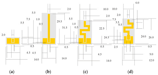 A top view of configurations of the CPW and antennas during the design process: (a) coplanar waveguide; (b) monopole antenna; (c) monopole antenna based on the Minkowski curve; (d) proposed antenna. All dimensions are in mm.