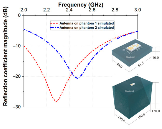 Figure 3 displays the simulated reflection coefficients when the proposed antenna was placed on Phantom 1 and Phantom 2. Looking at the reflection coefficients, it is clear that the antenna exhibited bandwidth from 2.0 to 2.65 GHz (on Phantom 1) and from 2.25 GHz to 2.70 GHz (on Phantom 2) at |S11| < −10 dB covering MBAN and ISM. A shift of the resonance frequency from 2.28 GHz (on Phantom 1) to 2.47 GHz (on Phantom 2) was also observed. Observed differences are due to the difference in dimensions between Phantom 1 and Phantom 2.