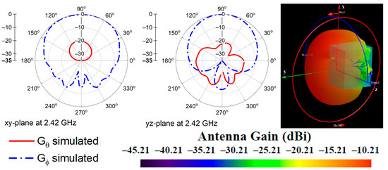 The radiation characteristics of the antenna were investigated across the bandwidth of 2.36–2.5 GHz when the antenna was placed on Phantom 2. Figure 4 shows the simulated radiation patterns at 2.42 GHz, in the xy- and yz-plane. The radiation patterns at frequencies from 2.36 GHz to 2.5 GHz showed similar behavior.