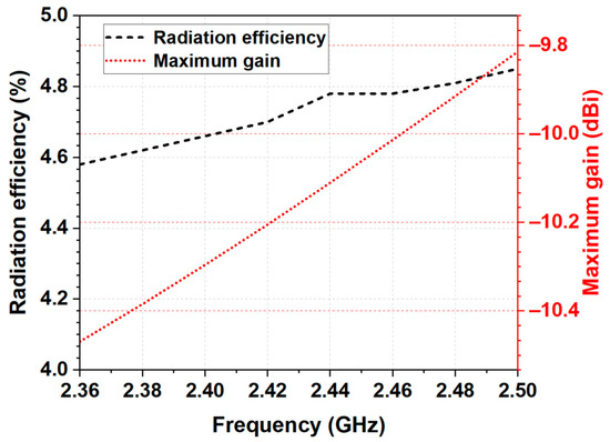The simulated maximum gain is given in Figure 5. As seen, the maximum realized gain varied between −10.5 dBi and −9.8 dBi and increased with frequency. The negative antenna gain is due to the power absorbed in the homogeneous phantom. Moreover, the antenna showed stable radiation efficiency (between 4.6% and 4.83%) in the frequency range of 2.36 to 2.5 GHz, which is appropriate for health telemetry applications.