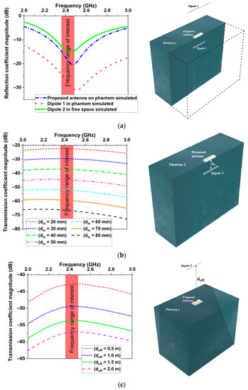 The capability of the proposed antenna for in- to on-body (scenario 1) and on- to off-body (scenario 2) communications was also studied. Figure 6a presents the setup for numerical studies of the transmission performances of the proposed miniaturized antenna. As seen, the setups consisted of two dipoles (Dipole 1 and Dipole 2) and a homogeneous phantom (Phantom 2). Dipole 1 was designed to resonate at 2.508 GHz when incorporated into Phantom 2, while Dipole 2 was designed to resonate at 2.444 GHz in free space. The simulated reflection coefficient magnitudes versus frequency are presented in Figure 6a for the two dipoles.