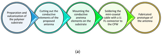 A schematic presentation of the antenna prototype is depicted in Figure 7a. In the first step of the fabrication process, the antenna substrate was prepared by mixing natural rubber, vulcanization accelerators, compatibilizers, and filler (TiO2) in an open laboratory two-roll mill. The mixture was vulcanized to a plate with dimensions 150 mm × 150 mm × 2.5 mm. In the second step, the conductive elements of the proposed antenna were fabricated from brass foil using a cutting plotter. Next, the conductive elements were mounted on the substrate with liquid rubber glue. Lastly, a mini coaxial cable assembled with a U.FL connector was soldered to the CPW for measurement purposes. Photographs of the fabricated antenna and experimental flat semisolid 2/3 muscle phantom are presented in Figure 7b.