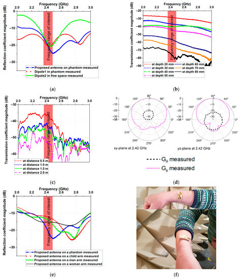 Figure 8b,c display the measured transmission coefficients for scenario 1 (in- to on-body communications) and scenario 2 (on- to off-body communications). Comparing the transmission coefficients presented in Figure 6 and Figure 8, we can see that the measured results agreed well with the simulations in the frequency range of interest.