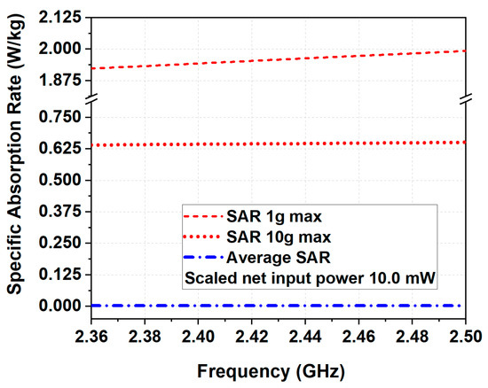 Results show that the highest 1 g (1.98 W/kg per 10 mW of antenna delivered power) and 10 g (0.62 W/kg per 10 mW of antenna delivered power) SAR values occurred at 2.48 GHz (see Figure 9). According to the specification provided by the ICNIRP [11], SAR values must be no greater than 2 W/kg averaged over 10 g of tissue. Consequently, the 10 g SAR was below the European threshold of 2 W/kg and the limit proposed in [11].