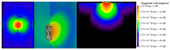 Figure 10 displays the SAR distribution at 2.48 GHz. It can be observed that the maximum SAR occurred at the surface underneath the antenna.