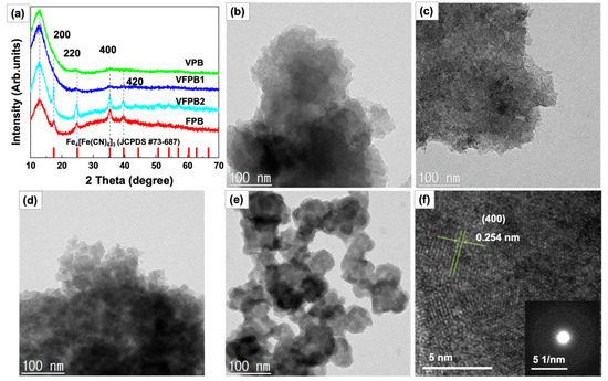(a) X-ray diffraction patterns of VPB, VFPB1, VFPB2, and FPB samples; transmission electron microscope images of (b) VPB, (c) VFPB1, (d) VFPB2, and (e) FPB; (f) high-resolution image of VFPB1 samples; inset: selected area electron diffraction pattern.