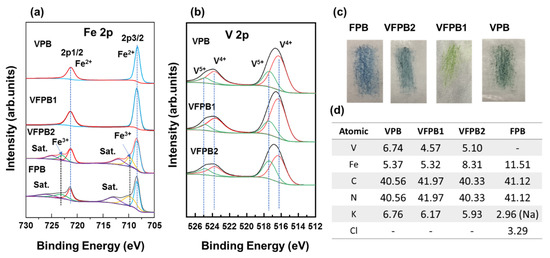 High-resolution X-ray photoelectron spectra of (a) Fe and (b) V; (c) photographs of Prussian blue-green sample powders on weighing paper; and (d) atomic percentage of V, Fe, C, N, K(Na), and Cl in VPB, VFPB1, VFPB2, and FPB.