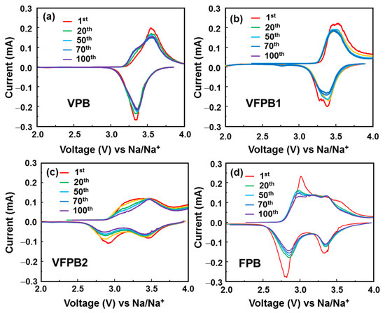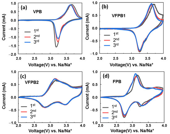 Cyclic voltammetry (CV) profiles of the first three cycles of (a) VPB, (b) VFPB1, (c) VFPB2, and (d) FPB cathodes.