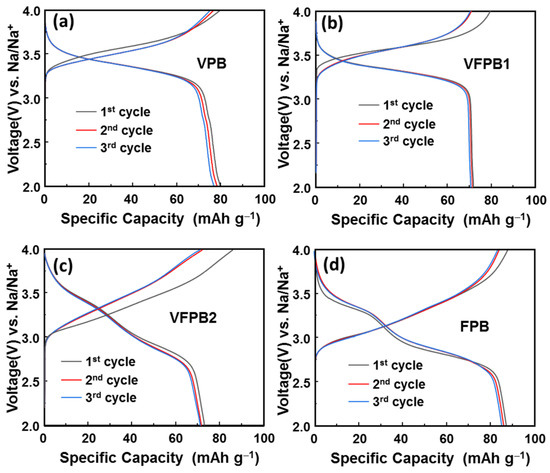 Figure 4 shows the initial voltage profiles of VPB, VFPB1, VFPB2, and FPB electrodes in the voltage range of 2.0–4.0 V vs. Na/Na+. The voltage profiles of electrodes with high and low V concentrations were different. During discharging, VPB and VFPB1 demonstrated ~3.3 V, whereas VFPB2 and FPB exhibited two voltage platforms at approximately 3.4–3.5 and 2.7 V. These discharge platforms corresponded to the cathode reduction potentials. Thus, the use of V in PBAs passivates high-spin Fe3+/Fe2+ and retains only low-spin Fe2+ ions, thus enhancing the voltage profiles of the batteries. The incorporation of V in PBA results in a capacity-voltage profile trade-off where the capacity is slightly reduced while the voltage platform is increased. However, a mixed state of Fe2+, Fe3+, and V4+ exists in the PBA lattices of the VFPB2 electrode, which makes its electronic structure unstable and induces a faster capacity decay than those in the other electrodes.