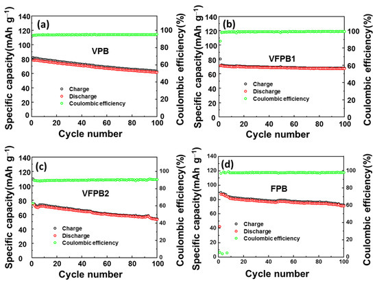 Cycling performances of (a) VPB, (b) VFPB1, (c) VFPB2, and (d) FPB cathodes at 50 mA g−1 over 100 cycles.