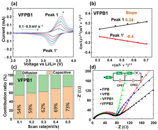 (a) CV curves; (b) fitted lines of i/v1/2 vs. v1/2 at different scan-rate voltages (v) from 0.1–0.5 mV s−1; (c) capacitance- and diffusion-controlled contribution ratios of the currents of VFPB1 cathodes; and (d) Nyquist plots for impedance measurement of FPB, VPB, VFPB1, and VFPB2 cathodes with inset of equivalent circuit.