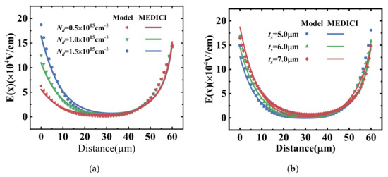 However, for the lateral power devices with 2D coupling effects that cannot be ignored, the avalanche breakdown voltage of the device can no longer be directly solved by using the Fulop equation and analytical electric field profile. A typical silicon-on-insulator (SOI) lateral power device is shown schematically in Figure 1. The SOI layer thickness is ts and the dielectric constant is εs. The buried oxide (BOX) layer thickness is tox and the dielectric constant is εox. When the devices are reversed-biased, the lateral power device operates in off-state, in which case the lowly doped drift region sustains most of the applied voltage by depletion. Once the applied voltage exceeds the breakdown voltage, a great number of electron–hole pairs are generated by the impact ionization process, forming a big current between drain and source contacts, and avalanche breakdown occurs. Avalanche breakdown can occur either when the drift region is partially or fully depleted. Yet, for the purpose of device optimization, the practical devices are mostly designed to have avalanche breakdown when full-depletion conduction is reached. Figure 2 shows that the surface electric field distribution for different device structure parameters derived from the virtual graded junction theory and the TCAD simulation tools, and the agreement between the model and the simulation results proves the accuracy of the breakdown model [15,16,17].