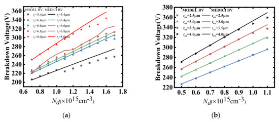 (a) Variation curves of BV with ts and Nd for different ts at full depletion of the drift region. (b) Variation curves of BV with tox as and Nd for different tox at full depletion of the drift region.