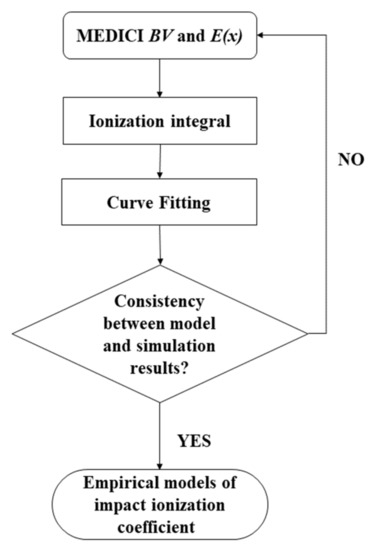 Figure 6 shows the flowchart for the extraction of the impact ionization coefficients for lateral power devices. The modified impact ionization coefficients are obtained by substituting the surface electric field (E(x)) and simulated/measured BV into the ionization integral equation. In order to make the ionization integral equal to 1, as the avalanche breakdown condition requires, the modified impact ionization can be given as follows: