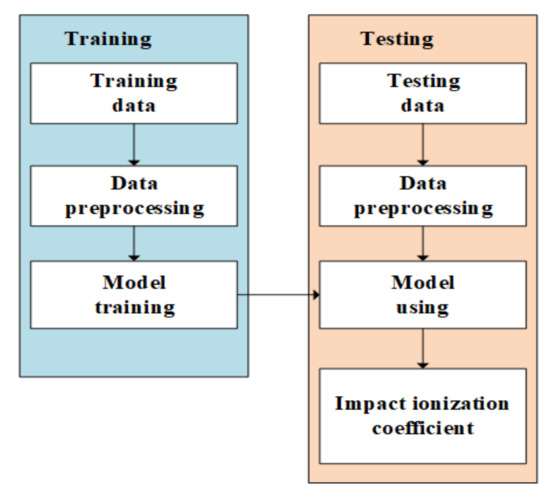 Because of the complexity of the impact ionization coefficient prediction, the conventional method of the empirical model is no longer applicable considering that the wide range of device parameters may vary. Therefore, the machining-learning-based method is employed to simplify the modeling of impact ionization coefficient. The basic overflow of the proposed modified impact ionization coefficient prediction method is composed of two essential parts, which are the prediction model training and model employment. The DNN model is trained using a group of labeled input and output data in order to establish the inherent relationship between the input and output. Clearly, the key to the modified impact ionization coefficient prediction approach is to form a well-trained neural network. The establishment of the neural network can be divided into two parts. The neural network design is the initial step and the neural network training is the second step. First, the neural network depth (the number of neural network levels), the number of nodes per layer, and the purpose of each node’s activation are required. As a rule, the structure of the network is determined by the complexity of the problem and the number of characteristics. The neural network model’s training makes up the second step. In order to lower the loss function, the weights and biases of the network are modified through backward propagation of the error after the error between the predicted value and the true label is obtained during model training. In this step, the model’s optimization function and loss function are created as well. We then create the framework for the prediction problem.