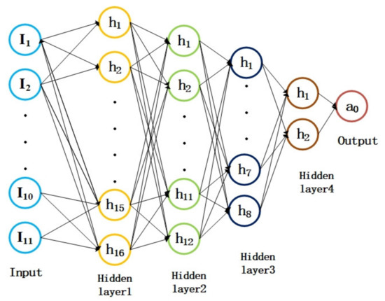 Figure 7 depicts the general process for predicting the impact ionization coefficients using deep neural networks. First, we divide the collected device structure parameters as well as the impact ionization coefficients into two parts: the training data and the test data. The DNN and the training data are then used to train a model for the impact ionization coefficients, and, finally, the test data are used to test the accuracy of the prediction model [19,20,21,22]. As shown in Figure 8, the DNN used in this work consisted of four hidden layers, an input layer, and, finally, an impact ionization coefficient unit. The input layer consisted of the 11 above-mentioned device structure parameters, and the number of neurons in the four hidden layers was adjusted according to the experimental results.