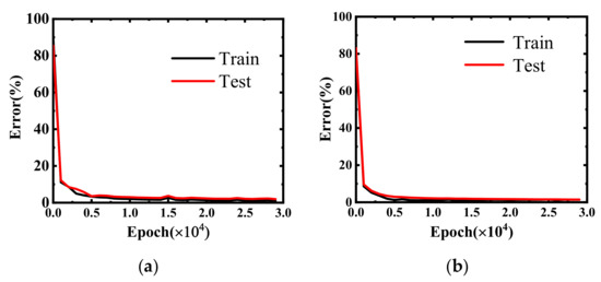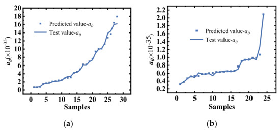 The error curves for the predicted impact ionization coefficients for the training and test sets are shown in Figure 9. The error plot demonstrates the high accuracy and convergence of the impact ionization coefficient prediction model, and the consistency of the training and prediction error curves indicates that the model was trained without overfitting. The high agreement between the predicted and tested values of the impact ionization coefficient is shown in Figure 10, thus demonstrating the high accuracy of the DNN-trained impact ionization coefficient prediction model. The results show that the average error of the impact ionization coefficient was less than 6% compared with the TCAD simulation.