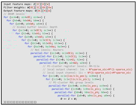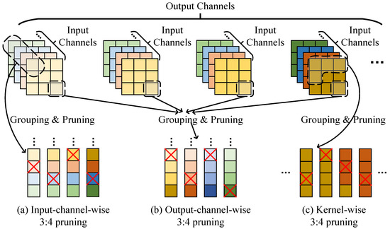 For input-channel-wise pruning, the weights with the same positions in different input channels in the same filter are flattened and converted into a one-dimensional vector. For output-channel-wise pruning, the weights with the same kernel position and input channel position in different filters are grouped together. Lastly, for kernel-wise pruning, the weight tensor is flattened along the kernel dimension and pruned accordingly. For input-channel-wise and kernel-wise sparse patterns, weights are pruned structurally across the inner production. However, typical kernel sizes ( 3 × 3 , 5 × 5 , 7 × 7 , etc.) provide inadequate partition space for N:M. Im2col [18] conversion can be exploited in the kernel-wise N:M acceleration but introduces additional memory access. Output-channel-wise sparsity partitions weights across filters and prunes them with the N-configuration. The sparsity can be mapped regularly to an outer production. Channel-wise prunings have ample partition space and do not affect the reuse property of the convolution. The pruning dimension will not affect the sparse network accuracy, which will be shown in ablation experiments in Section 5.