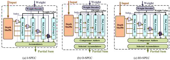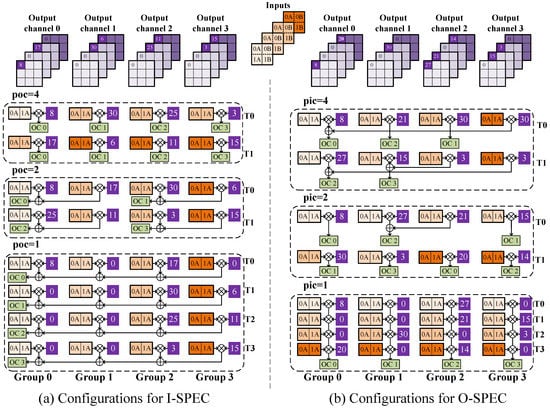 Three types of SPECs processing different channel-wise sparse are illustrated in Figure 3. The I-SPEC, shown in Figure 3a, is utilized for the input-channel-wise N:M sparse pattern acceleration. Independent data selectors are inserted before input ports of multiple groups to support input channel sparse. The output ports of groups are connected to G × P PSUM accumulators in parallel. Various configurations of the I-SPEC are shown in Figure 4a, where poc is used to represent the output channel parallelism. When poc equals one, all groups are configured to process weights inside the M-tile of one filter. Inter-group accumulation is required, as shown in this figure. Groups would be idled with a sparsity where N is not the integral multiple of four. However, if poc equals four, no extra accumulations will be induced across groups, and groups will be fully exploited regardless of the sparsity configuration. Hence, with the poc control, each SPEC can extend the weight parallelism without decreasing hardware efficiency.
