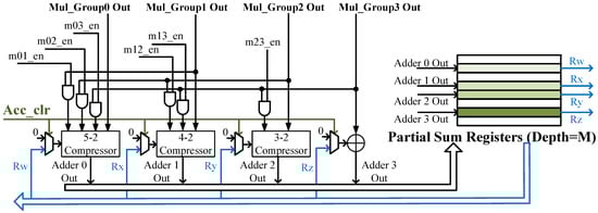Figure 3b is developed for the output channel N:M sparse pattern named the O-SPEC. It decodes indexes to control the PSUM processing. The processing details are shown as Figure 4b, where the pic denotes the input channel parallelism of the SPEC. With the fine-grained sparsity intra-M-tile, indexes may be identical across different groups. When processing with an input channel sparse, the independent multiplexer does not affect each other. Nevertheless, for output sparse, identical indexes lead to accumulation across groups. The problem is more complicated with the randomness intra-M-tile. To solve this problem, we add a module called Compressor Adders between MUL groups and accumulators to achieve the pre-addition before accumulation and induce input priority in the design accumulators. Figure 5 shows adders in detail. The m 02 _ e n is the signal that indicates whether the index of group0 and group2 are identical. If they are the same, the signal is pulled high to add the PSUM of group0 and group2. When writing back to the partial sum register, only Adder0 Out is enabled. The design of Figure 3c combines the aforementioned features and can support both input and output channel N:M sparse patterns, known as the IO-SPEC.