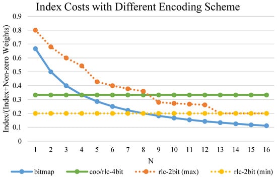 Figure 6. Comparison of different encoding schemes with M = 16 . For RLC, the ‘run length’ is 4 (2 bits), and the compact and loose distribution of zeros are shown as ‘min’ and ‘max,’ respectively.