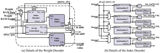 The SPEC can be configured flexibly to process sparsity. Parallelisms for input-channel and output-channel inside the SPEC are denoted by pic and poc, where pic × poc = G. Examples are illustrated to explain the configuration for Weight Decoder. With sparse_oic equals to 1, addresses for PSUM and input registers are generated by Index Decoder and P-CH Generator, respectively. When poc equals 4, independent bitmaps are decoded per Figure 7b. Meanwhile, identical inputs are fetched across groups. An identical bitmap is decoded with the Index Decoder when poc equals 1. Inputs from (3,2,1,0) channels are deployed in groups. PSUMs are added across groups and accumulated with the PSUM register selected by the decoded index.